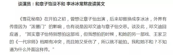 2012年,章子怡因为王家卫的电影《一代宗师》再度大放异彩,而《雪花与秘扇》的投资人邓文迪也透过媒体表示章子怡当时未有出演是因为档期无法排开,并不存在被李冰冰抢走资源一说。