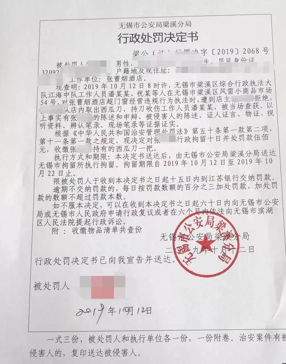 目前店主因暴力抗法和持刀伤人被公安机关行政拘留10日并处罚款500元