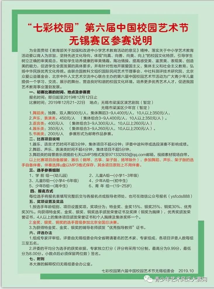 注:以上比赛项目自备服装、器乐(钢琴、古筝、架子鼓、扬琴除外),参加舞蹈、声乐、架子鼓的选手自备伴奏,伴奏选择u盘,其余项目原则不用伴奏。