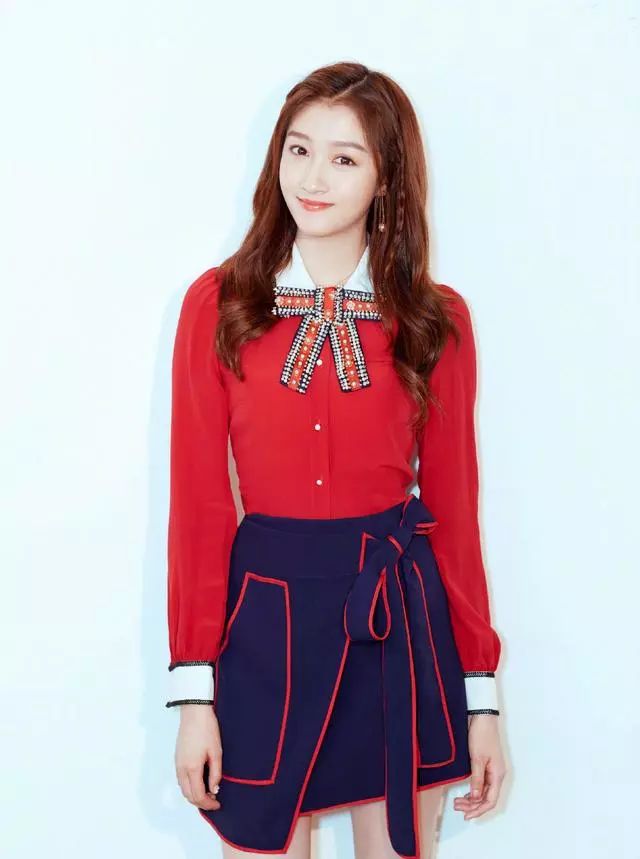 关晓彤平日里的造型都偏向于学院风,红色衬衫还扎个韩系日系的蝴蝶结领带,搭配蓝色镶红边的半身裙,乖乖的学生范。