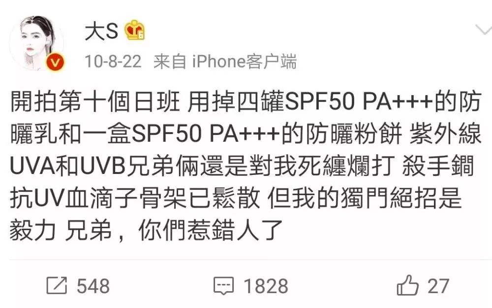 不仅如此,之前大S在拍戏的时候,曾经十天用掉了4管SPF50 PA+++的防晒和一盒SPF50 PA+++的防晒粉饼,这防晒做得,简直匠人级别!