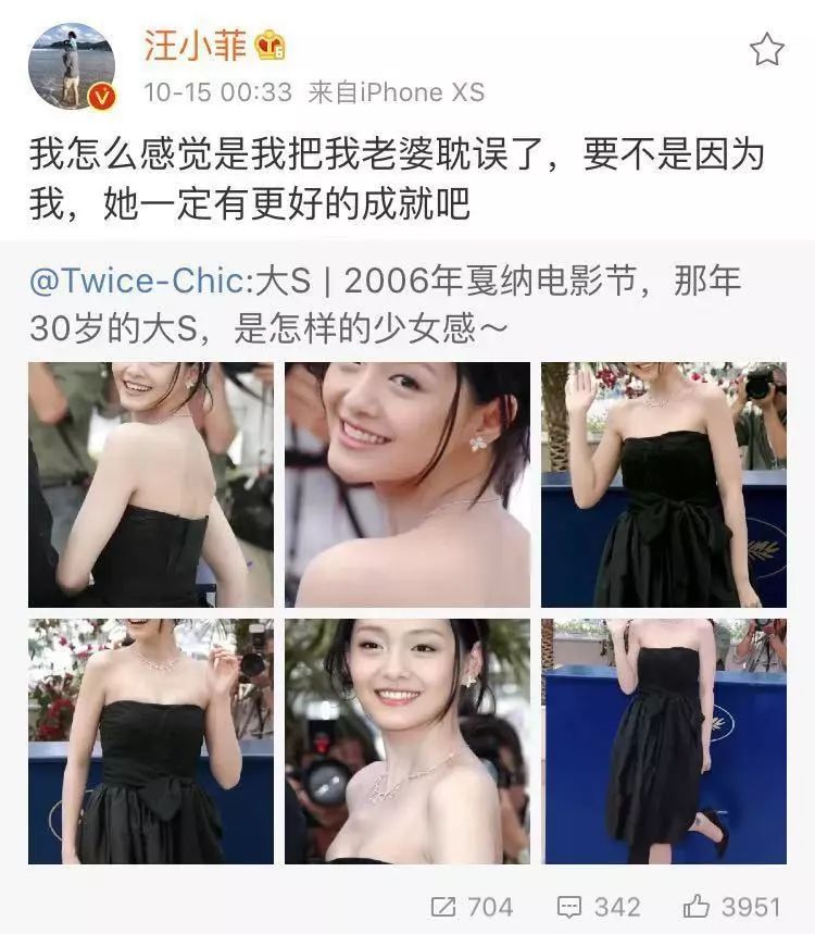 起因是,他刷到了一条有关于老婆大S的微博,微博记录了大S在2006年在走戛纳电影节红毯时的场景。