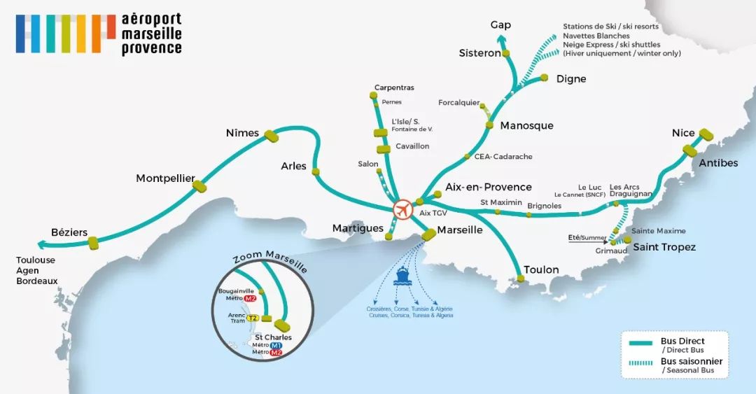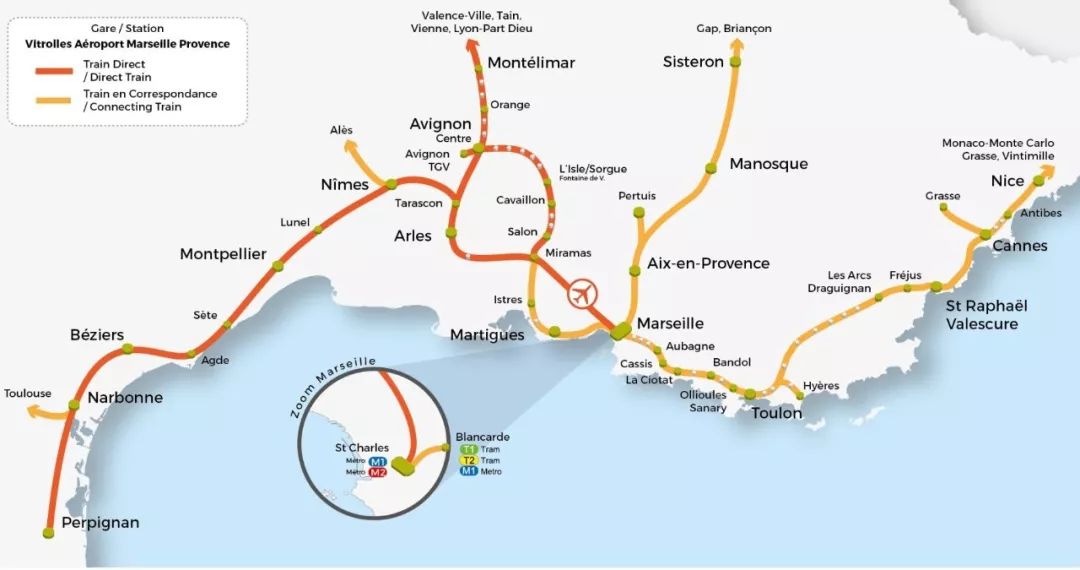 可直达城市:佩皮尼昂,Narbonne,Béziers,蒙彼利埃,尼姆,阿维尼翁,阿尔勒,Martigues,马赛