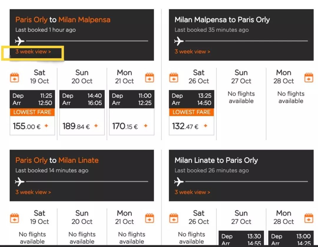 2.页面将会显示你出行时间整月的票价,一个一个看当然不可能,直接点击“3 week view"