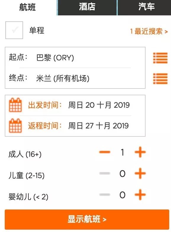 1.填好出行信息,点击“显示航班”