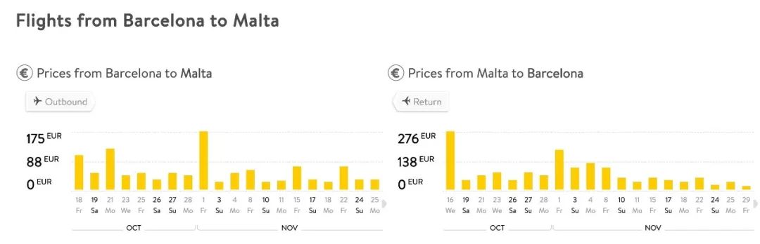 廉价航线可直接在首页上的“price calendar"中找到。比如20欧不到的马耳他单程机票(小编当年单程就得100+,还是大冬天淡季去的……)