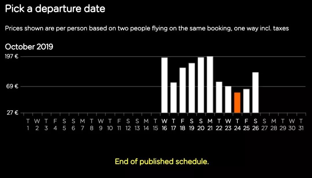 与易捷操作类似,填选好航班信息后,你将可得到出行日期当月3周内的所有票价柱形图。