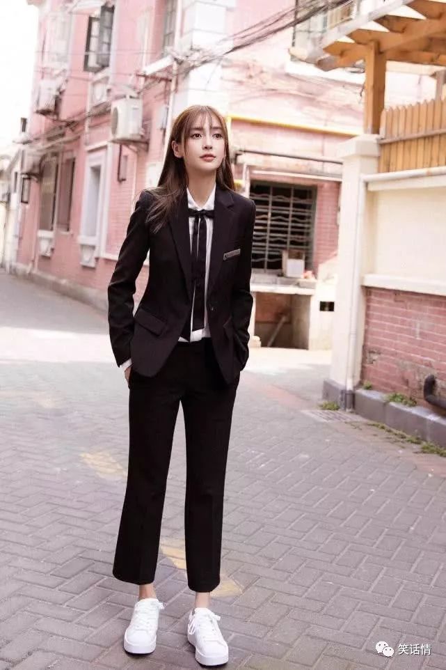 看多了小白鞋的穿搭,小编要让大家看看不同寻常的搭配。Angelababy穿了一身黑色的西服套装,她脚上竟然也搭配了一双小白鞋,一般人肯定不敢这样穿,因为西服套装如此正式又古板的单品,怎么能搭配小白鞋如此休闲又时尚的单品呢。但是baby却穿出了与众不同的味道,将正式感与休闲感相结合,竟然碰撞出了不凡的潮流感,给人痞帅痞帅的感觉,特别有气场~
