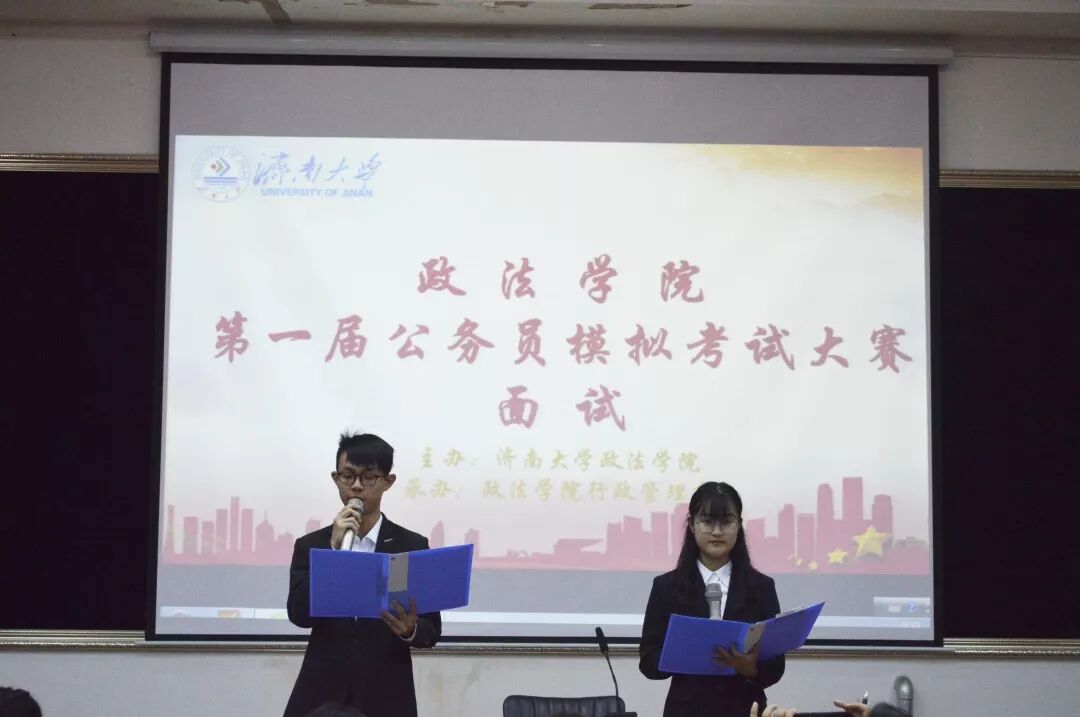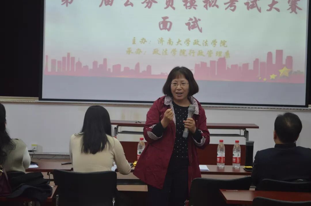 为增进学生对公务员考试的了解、提升学生在公务员考试中的应试能力,济南大学政法学院举办了第一届公务员模拟考试大赛。本次大赛由笔试和面试两个环节组成,面试环节于10月19日在第四教学楼模拟法庭举行,行政管理系宁有才、刘钟华、胡艳蕾等多位老师作为评委出席了本次比赛面试现场,大赛特邀政法学院党委书记徐庆国、院长梁丽霞、学生工作办公室主任黄茜老师出任嘉宾。