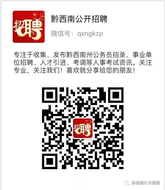 “黔西南公开招聘”微信公众号专注于收集、发布黔西南州公务员招录、事业单位招聘、人才引进、考调等人事考试资讯。关注专业,关注我们!喜欢就分享给您的朋友!