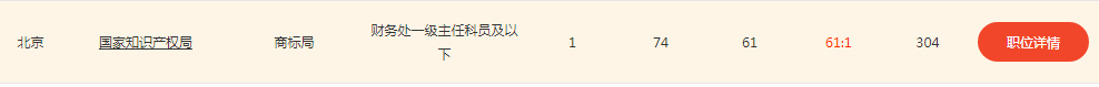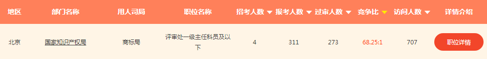 商标局(评审处一级主任科员及以下-招聘4人),目前报考人数311人,过审人数273人,竞争比68.25:1。