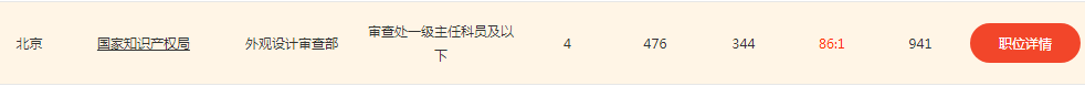 外观设计审查部(审查处一级主任科员及以下-招聘4人),目前报考人数476人,过审人数344人,竞争比86:1。