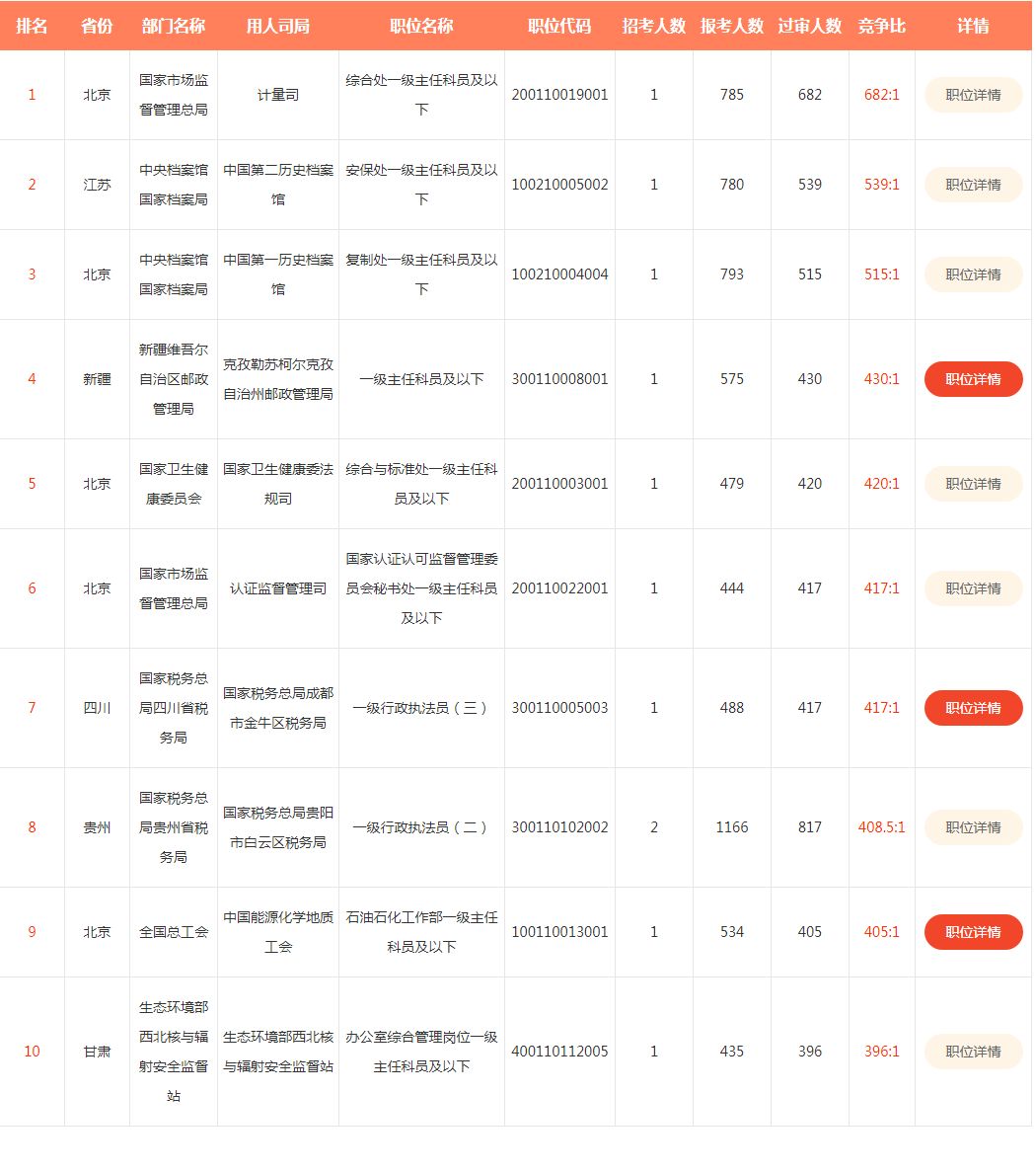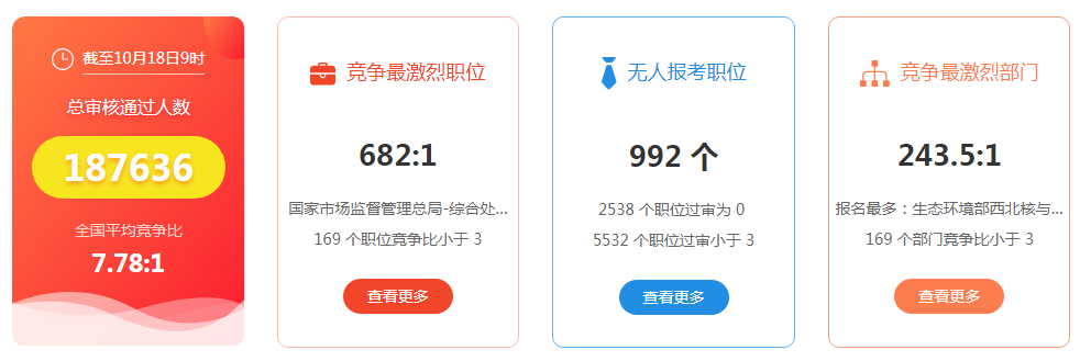 截至18日上午9时,报名系统已经有309153人报名,其中有187636人通过审核,992个职位无人报名,2538个职位审查通过为零;全国平均竞争比7.78:1,职位最高竞争比682:1。