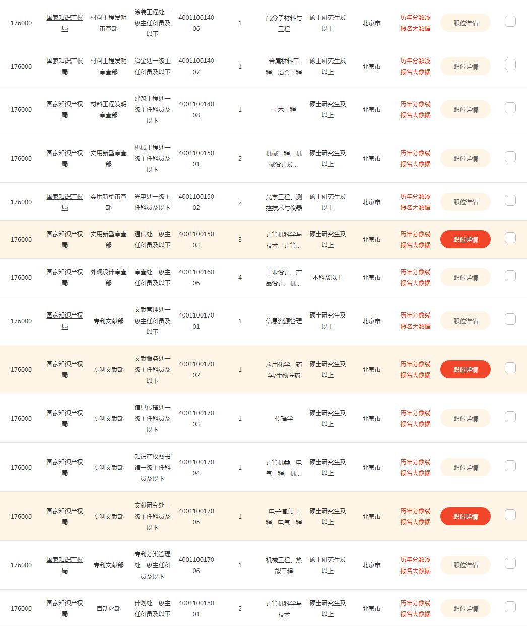 2020国家公务员考试报名正在如火如荼的进行中。小编特别整理了知识产权方面竞争最激烈的职位以供各位参考:外观设计审查部,目前报考人数476人,过审人数344人,竞争比86:1;商标局,目前报考人数311人,过审人数273人,竞争比68.25:1;商标局,目前报考人数455人,过审人数377人,竞争比62.83:1;材料工程发明审查部,目前报考人数58人,过审人数47人,竞争比47:1。