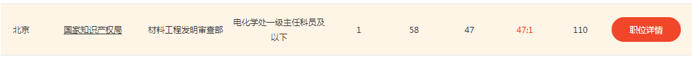 材料工程发明审查部(电化学处一级主任科员及以下-招聘1人),目前报考人数58人,过审人数47人,竞争比47:1。