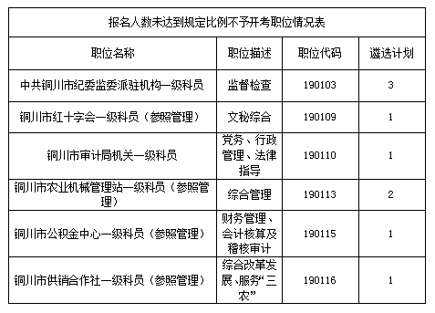 2019年铜川市市级党政机关公开遴选公务员(参照管理单位工作人员)报名工作已结束。现就遴选职位取消及改报具体事项公告如下: