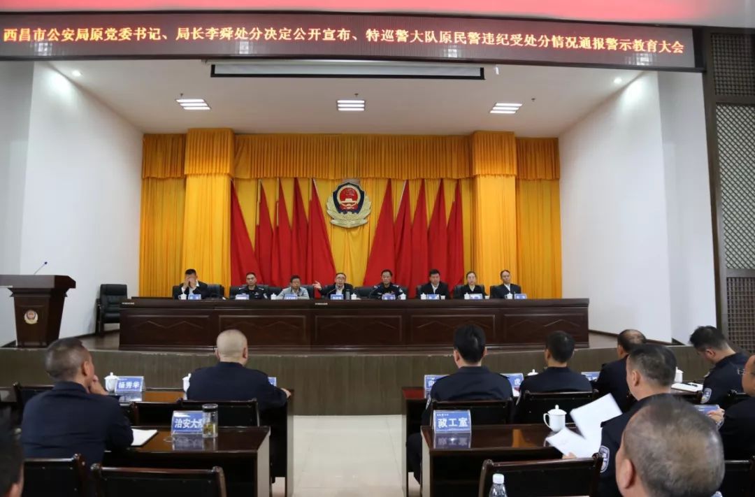 根据凉山州纪委监委安排,10月17日,西昌市纪委监委在市公安局组织召开“西昌市公安局原党委书记、局长李舜处分决定公开宣布、特巡警大队原民警违纪受处分情况通报警示教育大会”。市委常委、市纪委书记、市监委主任刘学强,市委政法委副书记沈子古布,派驻政法委纪检监察组,以及市公安局党委全体班子成员、市公安局下设科所队中层副职以上干部、李舜所在的警务保障室支部全体党员、民辅警代表参加了大会。