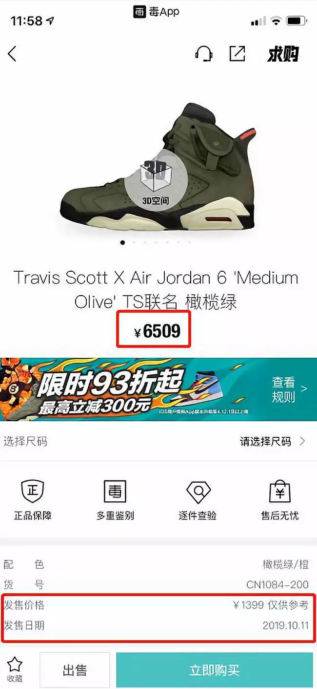 而记者从毒APP上看到,Air Jordan 6一款联名鞋刚刚以1399元的价格发售,短短几天时间,目前在平台的售价已经是6509元起, 是发售价格的4倍以上。