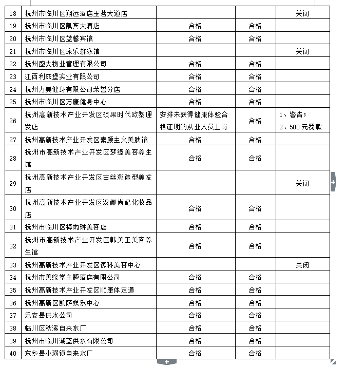 按照《国家卫生健康委办公厅关于印发2019年国家随机监督抽查计划的通知》(国卫办监督函﹝2019﹞110号)要求,近期抚州市卫生计生综合监督执法局,完成了市本级卫生计生监督抽查,共监督抽查了40家公共场所和生活饮用水经营单位,其中住宿场所20家、游泳场所5家、美容美发场所8家、音乐厅1家、沐浴场所2家、农村集中式供水3家、城市集中式供水1家。现将监督抽检结果公示如下: