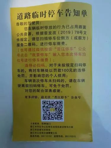 晋江市停车办有关工作人员提醒,晋江停车收费时段全天开放,7:30-21:30为收费时段,其余时间免费。如果停车五分钟内未扫码启动缴费,将视为违法停车,处罚款100元,相关不良记录纳入征信。“由于停车收费刚开始执行,故23日前,如果停车未扫码缴费,只给予警告处罚。”