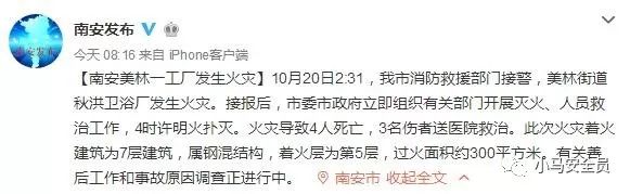 2019年10月20日凌晨2点左右,福建省南安市美林街道秋洪卫浴厂突然发生火灾,凌晨4点左右,明火被扑灭,有4人在此次大火中丧生,另有3人受伤。