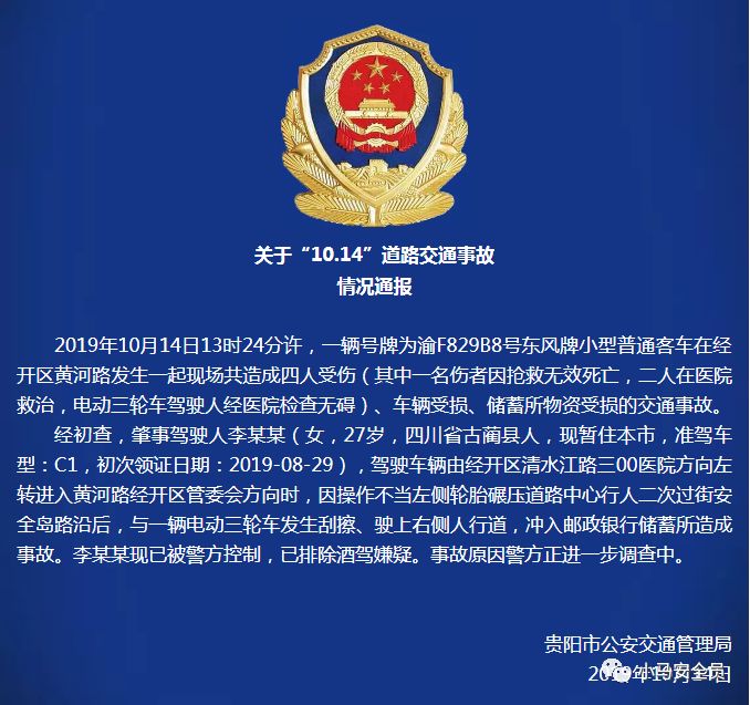 10月14日中午1点半左右,贵州贵阳一辆行驶中的越野车一头撞进了附近的银行,造成1死3伤。据现场目击者介绍,越野车先是撞翻了拉矿泉水的三轮车,然后急打方向转了90度,一头撞进了银行。三轮车驾驶人、银行工作人员和一名前来办理业务的市民被撞。