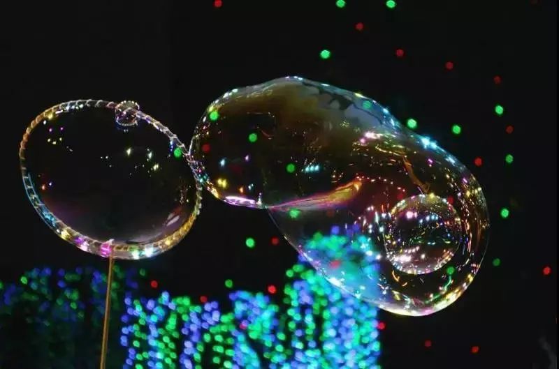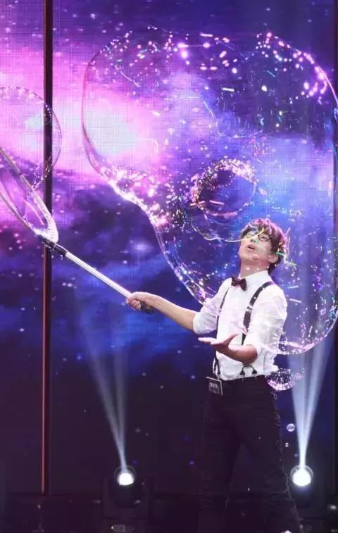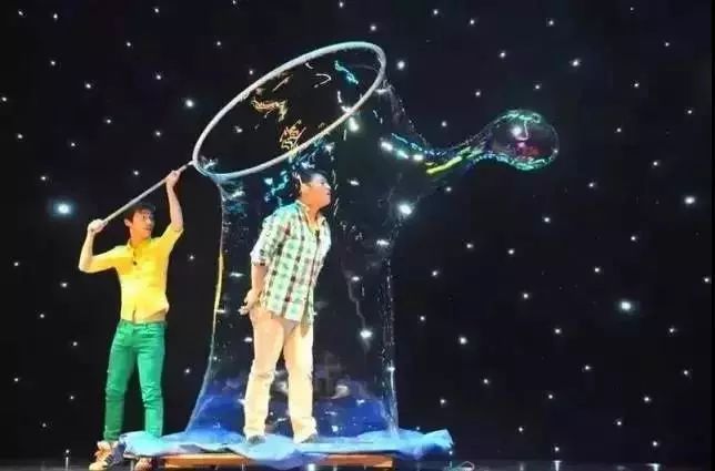 在舞台上的演员手里,肥皂泡泡可以有各种形状,圆的、扁的、长的、方的、椭圆的,泡泡上流光溢彩超级梦幻。