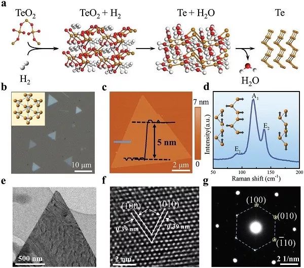 单质元素二维材料,包括石墨烯、锗烯、硅烯、硼烯和磷烯等,由于其独特的光电性质,在光电子学、拓扑超导以及量子自旋霍尔效应等领域引起了人们的广泛关注。然而,目前报道的单质元素二维材料大多集中在IIIA-VA族,而VIA族的元素却鲜有报道,作为其中代表性的元素,Te具有可调谐的带隙、优良的热电性能、快速光电导性能和各向异性的电导率等独特物理化学性质,在场效应晶体管、热电器件以及光电探测器等领域都具有潜在的研究价值和应用前景。然而,大多数报道的二维Te薄膜是通过溶液法或气相传输合成的,不可避免地会引入杂质、有机物和缺陷。因此,开发一种生长高质量的超薄Te薄膜的可靠方法仍然是一个巨大的挑战。