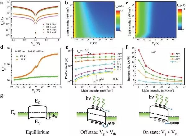 将Te场效应晶体管用于532 nm光电探测,与300 K时相比,在80 K时,在黑暗和光照下观察到的电流都要低得多,这是由于热效应抑制了缺陷以及降低载流子密度(图6a-c)。随着光强增加,光电流Iph增大,当栅极电压从-70 V变到70 V时,Ion/Ioff增加了约40倍,而响应率降低了约45倍。在没有光照和偏置的情况下,器件处于平衡状态,载流子在沟道中的传输由两个接触势垒控制。当器件处于OFF状态(Vg>Vth)时,Iph与Vds呈线性上升。相反,由于金属-半导体界面的势垒较低,在器件On状态(Vg<Vth)时,隧穿电流和热离子电流有利于聚集,导致光响应上升。