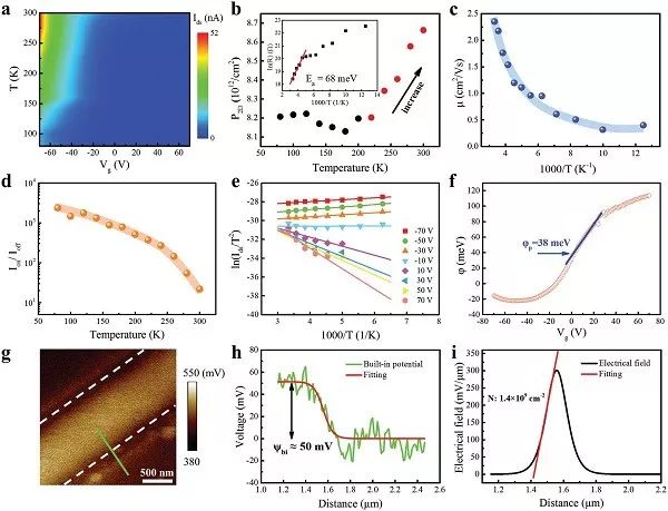 图5给出了在80 K-300 K不同温度下器件的电学输运特性,图5a表明二维Te薄片是P型半导体,与Te空位等内部缺陷有关。图5b为二维电子浓度P2D随温度的变化曲线,当温度从80 K上升到220 K时,P2D变化不大,而当温度高于220 K时,P2D急剧升高,这可以归因于Te薄片的缺陷态被热激活。随着温度升高,器件迁移率和开关比随之下降(图5c和d),图5f则显示了随Vg变化的肖特基势垒高度,大小约为38 meV。利用SKPFM来反映材料和电极之间的电位差(图g-i),内建电势大小约为50 mV,测得的本征掺杂浓度N约为1.4×109 cm-2。