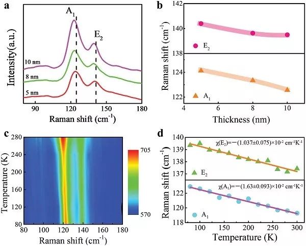 图3. Te薄片Raman图谱的厚度依赖性和温度依赖性