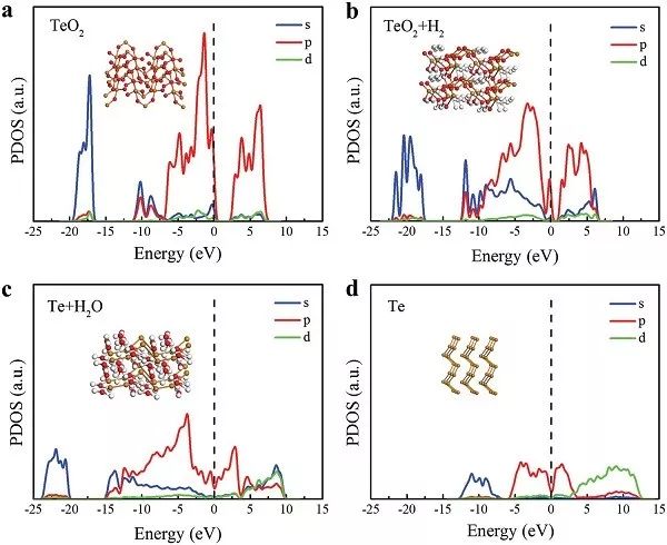 图2显示了在生长过程中的偏态密度(PDOS)谱的理论计算,当H2与TeO2在高温下反应时,形成中间过渡态,而中间过渡态不稳定,存在重排反应(TeO2+H2→Te+H2O),挥发性中间产物又可以提高前驱体的蒸气压,促进反应的进行。