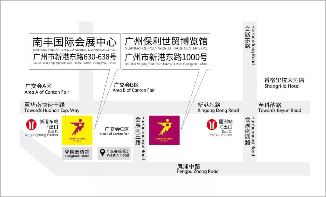 设计周路线主会场共两栋展览馆,分别为广州保利世贸博览馆(广州市海珠区新港东路1000号)、南丰国际会展中心(广州市海珠区新港东路630号)地铁出行:广州地铁八号线琶洲站C/D出口可直达保利世贸博览馆、新港东站F出口前行200米即达南丰国际会展中心;同时地铁各线可串联抵达,广州白云国际机场(三号延长线:机场南站)、广州火车站(二号线:火车站)、广州南站(二号线:广州南站);打车或自驾:可通过华南快速、天河立交、广州大道、琶洲大桥、猎德大桥等方向开往新港东路抵达。