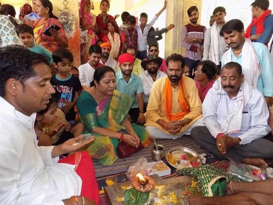 一大群人乌泱泱地围在一起,见证婚礼,焚香祝祷。其中,还包括印度中央邦妇女儿童发展部的部长Lalita Yadav。