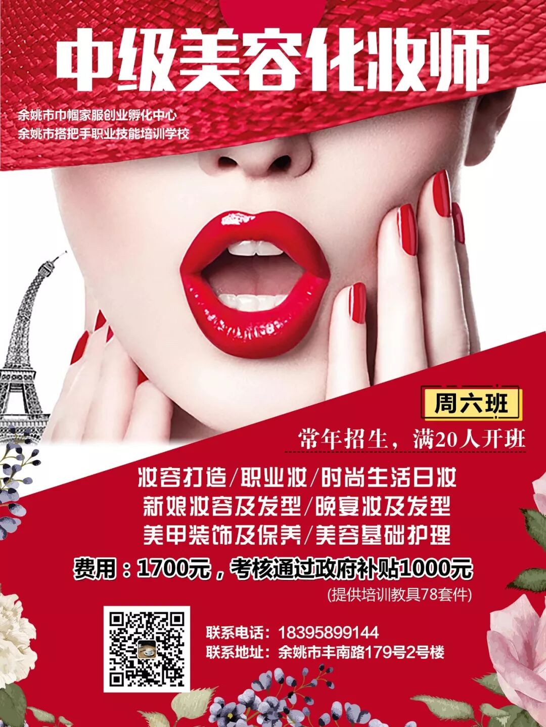 培训报名地点:余姚市搭把手职业技能培训学校 地址:余姚市丰南路179号联系人:姚老师联系号码:18395899144(微信二维码同号)