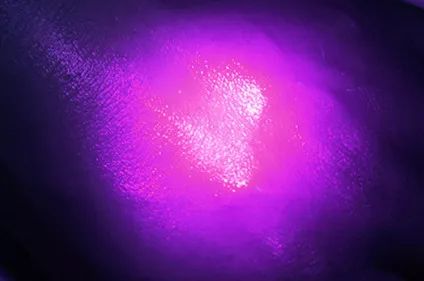 这是我做的荧光剂测试,把面膜精华液涂在手上,用荧光剂测试灯照射。照射出来呈现紫色,表示不含荧光剂,可以放心使用!