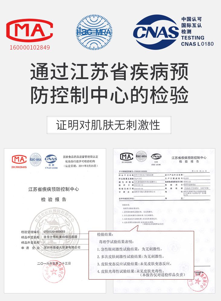 而圣雪兰这个品牌,成分都通过认证和检测,不含:荧光剂、 激素、 色素、 重金属,安全可靠,无论是孕期还是哺乳期都可以放心使用!