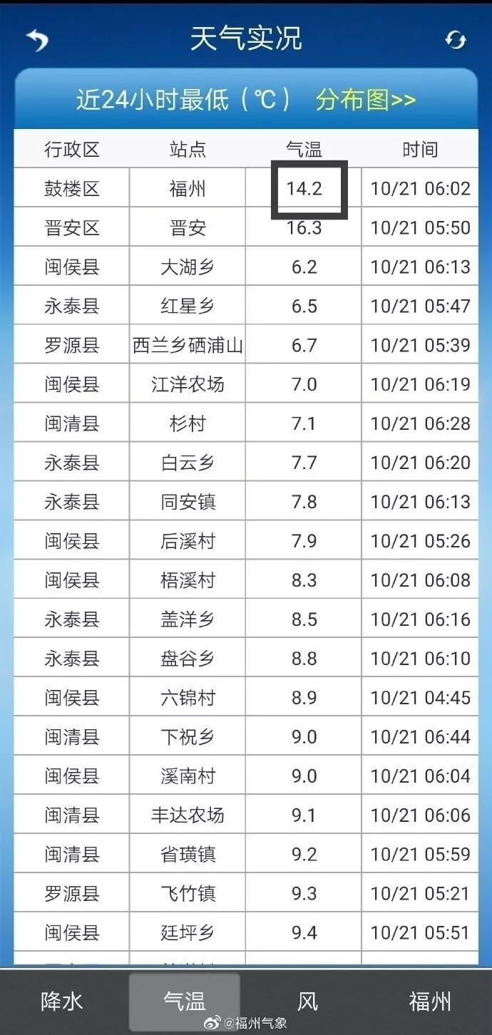 今晨福州乌山站气温14.2℃创今年下半年以来气温新低 ↓↓↓