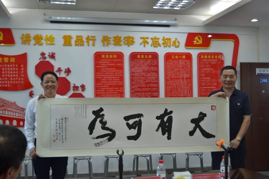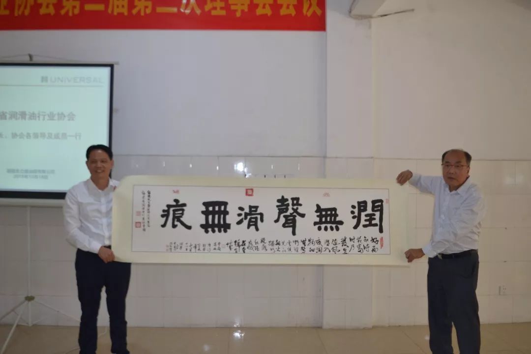 陈银汉会长(左)代表协会向福建省大力润滑科技有限公司赠送宝墨
