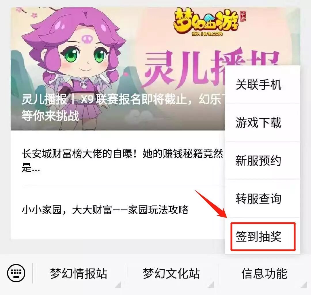 公众号菜单右下角“信息功能”→“签到抽奖”