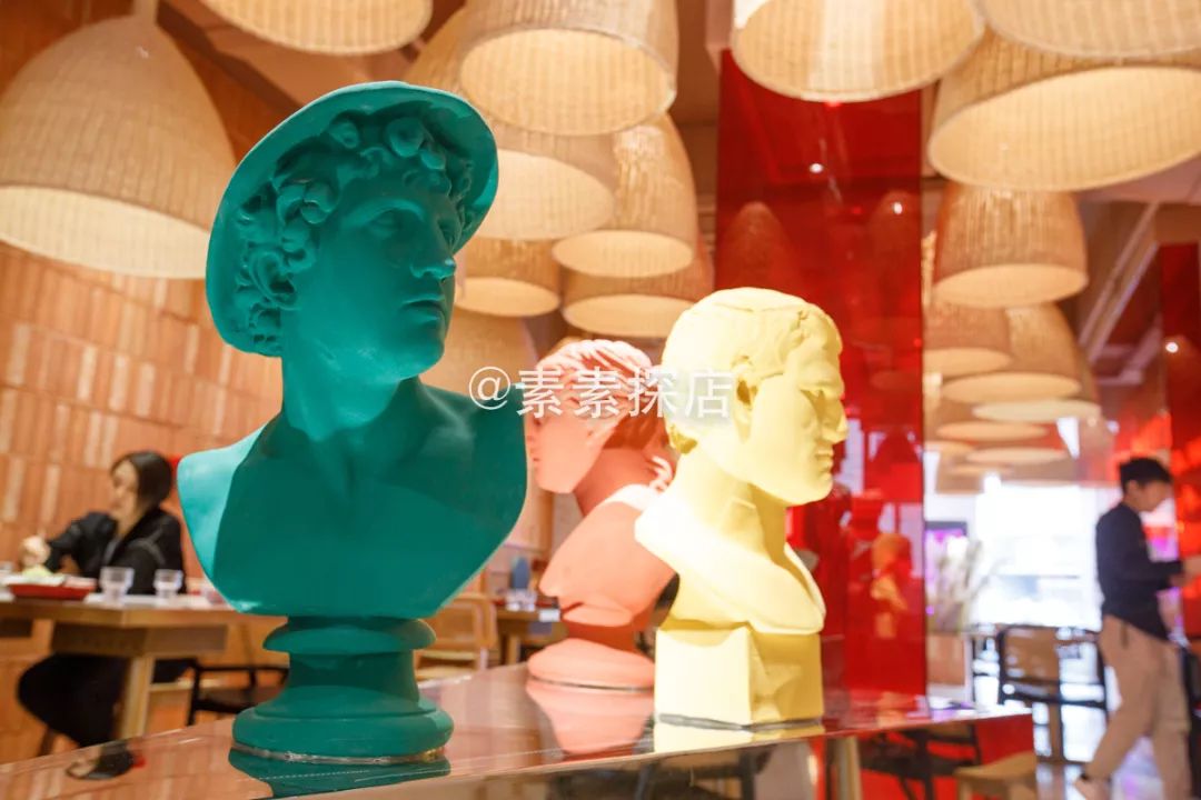 在呈现餐厅中式风格的同时,还点缀了西式雕塑风格的细节。过道上错落有致地摆了几个雕塑,又给人一种在艺术馆的错觉。一步一景,韵味很是独特。