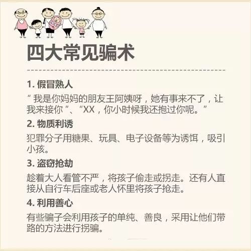 仅仅知道如何预防,还远远不够,我们大人和孩子都要学会并掌握如何辨别人贩子、及认清人贩子常用的四大手段。