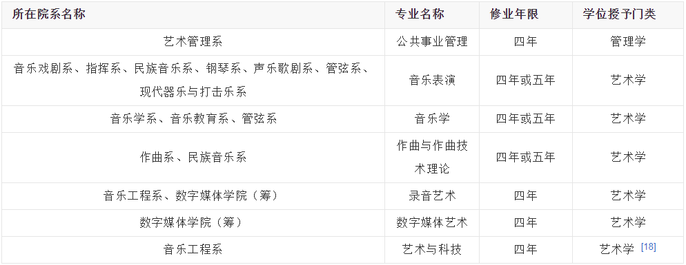 截至2018年10月,学校设有15个系(部),即作曲系、指挥系、音乐学系、民族音乐系、钢琴系、声乐歌剧系、管弦系、音乐教育系、音乐戏剧系、艺术管理系、音乐工程系、现代器乐与打击乐系、公共基础部、研究生部、数字媒体学院(筹)、马克思主义学院等。涉及7个本科专业、近20个专业方向。