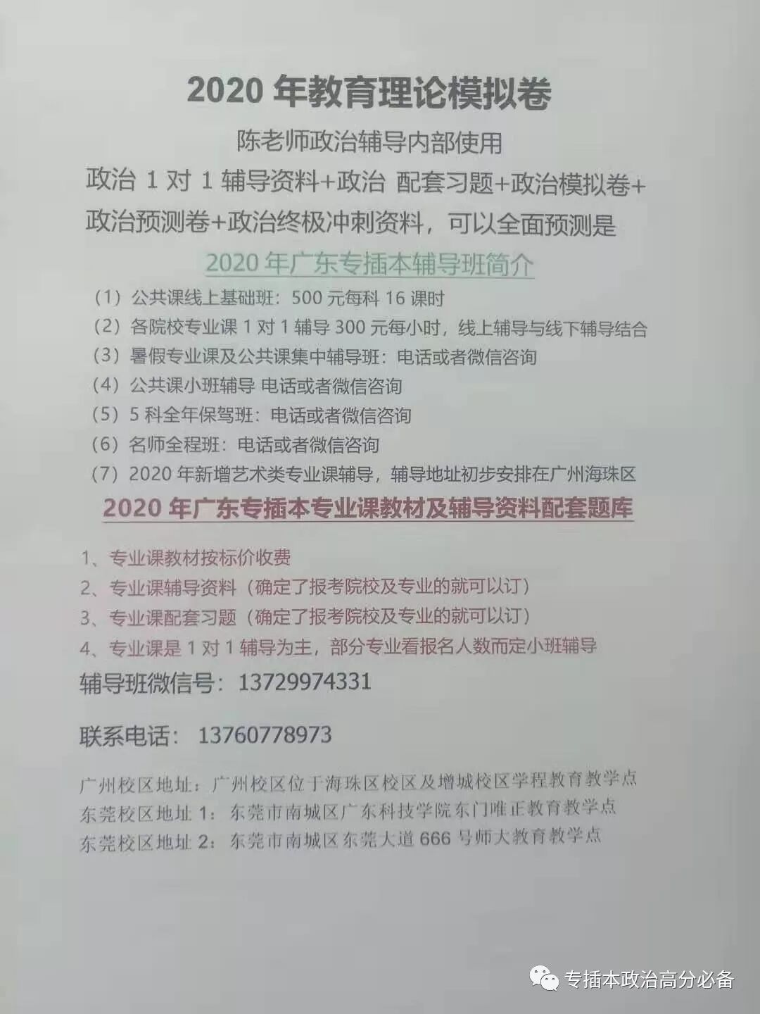 2020年广东专插本公共课及专业周末班、暑假班、小班辅导、保驾班正式接受报名,报名咨询微信:13729974331,联系电话:13760778973