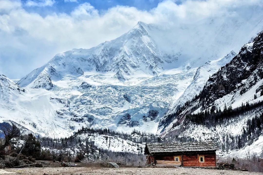 《中国国家地理》认定中国最美的六大冰川之一。冰川下是茂密的森林,两侧大山巍峨峻峭,雪山和云雾交织,如梦似幻。