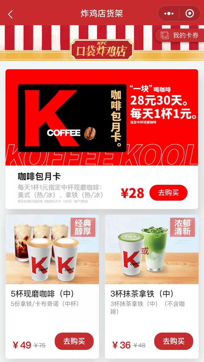 9月9日,肯德基口袋炸鸡店小程序推出了K-COFFEE咖啡包月卡(30天),只需要28元就可以享受30天、每天1元购买指定K-COFFEE中杯现磨咖啡。