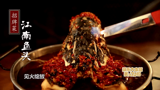 鱼头洗净以啤酒浇淋去腥提鲜,腌制半晌,热油大火,衡东剁椒炒至醇香,将剁椒覆盖周身小火蒸制十分钟取出,少许高度白酒点洒,见火绽放是为江南鱼头!中国人本来就喜欢红色加上火焰的感觉,给人的感觉让生活各方面的红火起来,鸿运当头嘛!