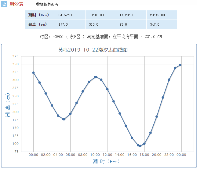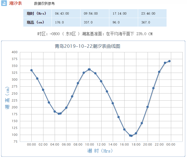 潮汐时间潮高第一次高潮09:56345cm第一次低潮04:44190cm第二次高潮23:36370cm第二次低潮17:13105cm10月22日-10月23日