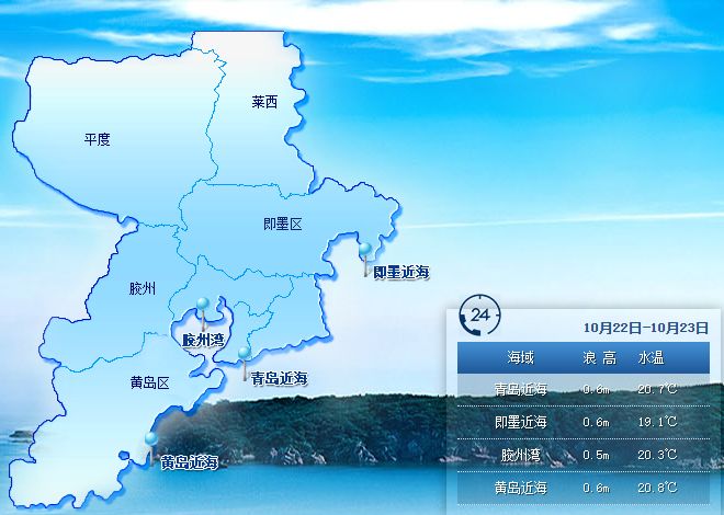 海 域浪 高水 温青岛近海0.6m20.7℃即墨近海0.6m19.1℃胶州湾0.5m20.3℃黄岛近海0.6m20.8℃