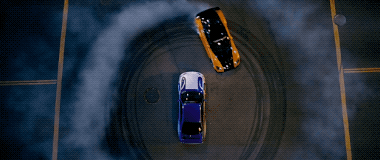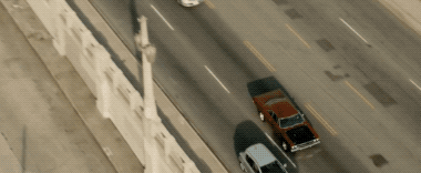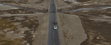 无人机从汽车侧面飞行,横切汽车行驶的道路,同时跟随主体摇镜头,汽车的前景与后景大幅度运动,增强了画面的速度感。